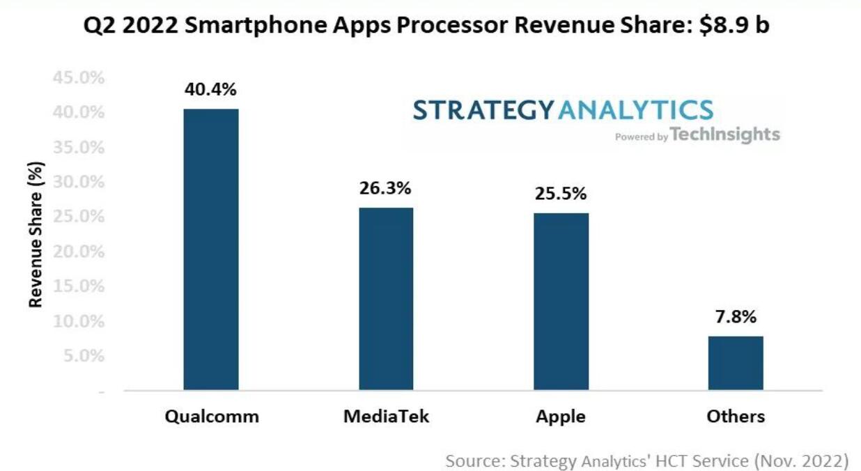 Qualcomm остается лидером на рынке процессоров смартфонов с 40%доходами дохода, за которыми следуют MediaTek (26%) и Apple (25,5%).