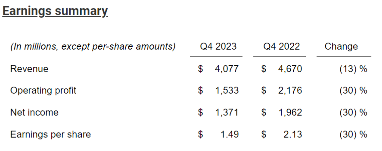 Бывшие Texas Instruments сообщили о доходе 2023Q4 в размере 4,08 млрд долларов, что на 10 процентов по сравнению с предыдущим кварталом и на 13 процентов по сравнению с аналогичным периодом прошлого года;Чистая прибыль составила 1,37 млрд. Долл. США, а прибыль на акцию составила 1,49 долл. США;Операционная прибыль составила 1,5 млрд. Долл. США, или 38 процентов доходов, что на 30 процентов по сравнению с аналогичным периодом прошлого года.