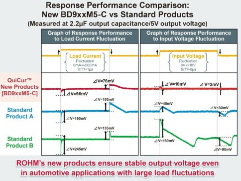 ECU и другие нижестоящие устройства часто подвергаются изменениям тока нагрузки во время работы, требуя LDOS с исключительными характеристиками отклика на нагрузку.Высокочастотный отклик имеет решающее значение для быстрого восстановления выходного напряжения, но достижение достаточной фазовой маржи для обеспечения стабильной работы была сложной.Чтобы решить эти проблемы, компания разработала серию BD9XXM5-C с ее собственной технологией высокоскоростной нагрузки.Эта технология позволяет LDO поддерживать выход в пределах 100 мВ от установленного напряжения, даже когда нагрузка быстро изменяется от 0 до 500 мА в 1 мкс.Низкое потребление тока 9,5 мкА (типичное) снижает энергопотребление в автомобильных приложениях.