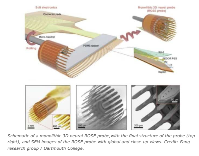 Новое поколение зондов мозга может трансформировать нейробиологию, позволяя исследователям отображать нейронную активность в трех измерениях, а не вдоль плоских плоскостей.Ученые из Дартмутского колледжа, Университета Питтсбурга, Университет штата Оклахома, и соавторы разработали методику для переворачивания плоской мягкой электроники в цилиндрические формы, создав трехмерные нейронные зонды, которые преодолевают ограничения обычных 2D -макетов.Сообщается, что в природе электроника это инновация - называемая розой или прокатка мягкой электроники - по сравнению с способом записать более богатые данные с меньшим тканевым напряжением.